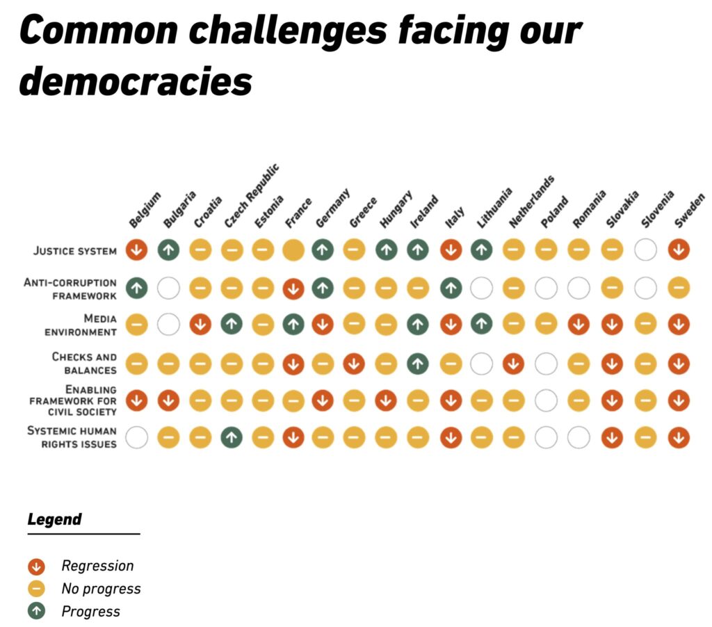 Liberties’ “Rule Of Law Report 2024” – a collaboration of 37 human rights organisations covering 19 EU countries, which the European Commission takes into account when it compiles its own annual report on the state of the rule of law in the bloc during the summer – found the pattern of the deterioration in the rule of law fell into several groups.